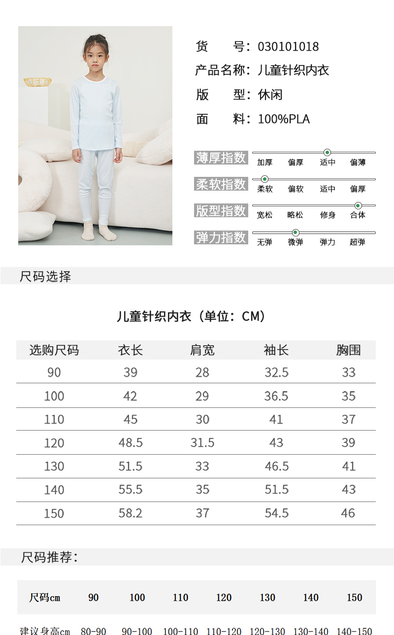 春秋抑螨抑菌儿童长袖针织内衣打底舒适弹力休闲居家服