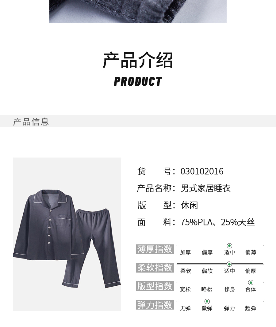 抑螨抑菌聚乳酸玉米纤维透气舒适秋冬男士睡衣套装家居